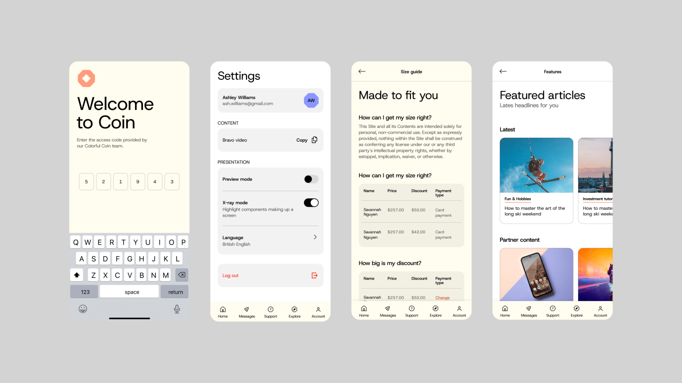The color system is designed to as flexible as possible – given that it needs to fit in with the branded content of Coin’s business partners as well as maintain its own expressiveness.